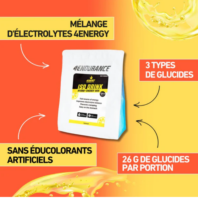 Boisson isotonique rafraîchissante et efficace, à base de trois types de glucides et du mélange d’électrolytes 4Energy, pour un niveau d'énergie élevé et une hydratation optimale pendant l'exercice.